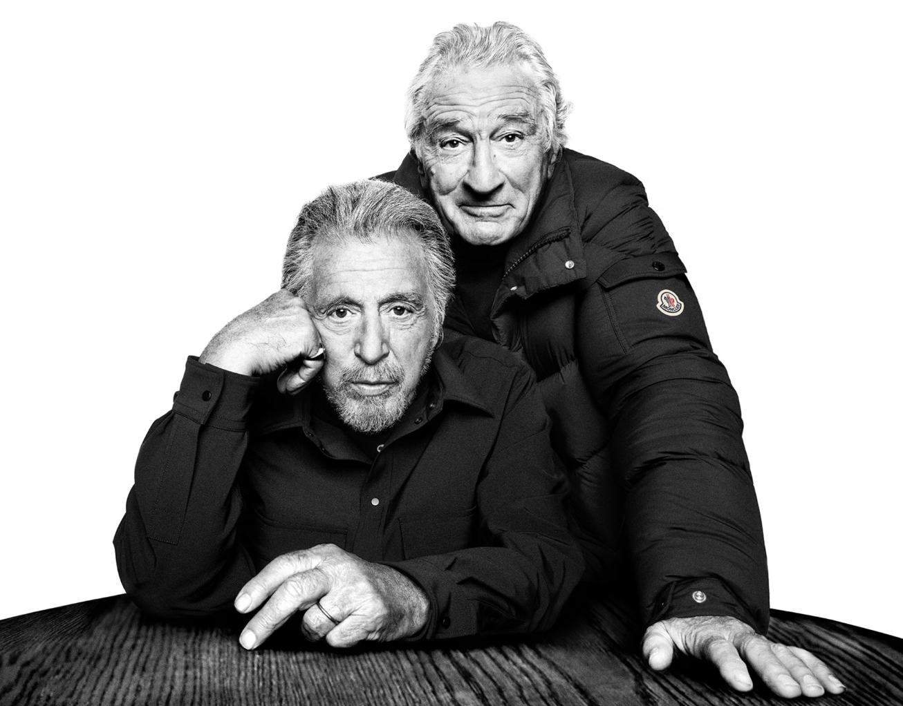 Moncler i-a adus împreună pentru prima lor campanie comună de brand, o odă vizuală alb-negru semnată de Annie Leibovitz, în care De Niro și Pacino privesc în tăcere obiectivul — cu aceeași intensitate cu care, odinioară, își măsurau replicile în „Heat”.