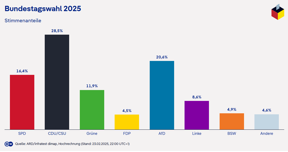 În paralel, Partidul Verzilor și Partidul Stângii (Die Linke) au obținut rezultate modeste, iar Partidul Liberal Democrat (FDP) și Alianța Sahra Wagenknecht (BSW) trec cu greu pragul electoral.