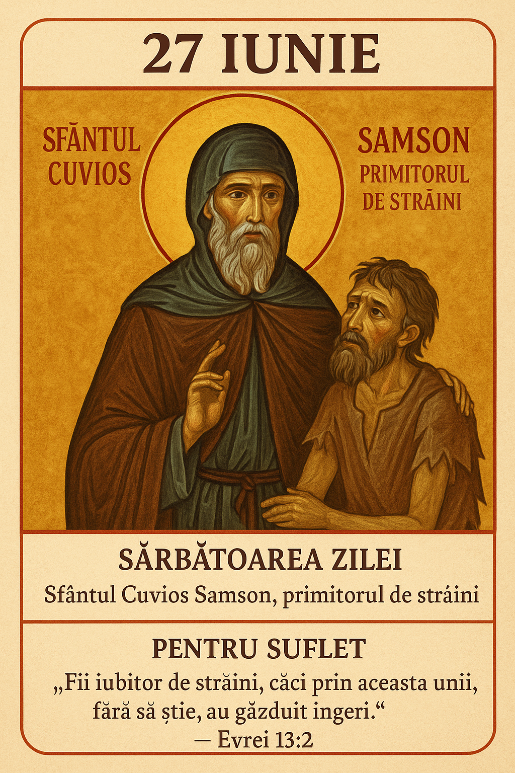 Pe 27 iunie, Biserica Ortodoxă îl prăznuiește pe Sfântul Cuvios Samson, primitorul de străini, un sfânt cu origini nobile care a ales o viață de smerenie, slujire și iubire față de aproapele. Samson a trăit în secolul al VI-lea la Constantinopol și a devenit cunoscut în tot imperiul bizantin pentru generozitatea sa extraordinară, pentru viața de rugăciune și pentru harul tămăduirii pe care îl avea.
