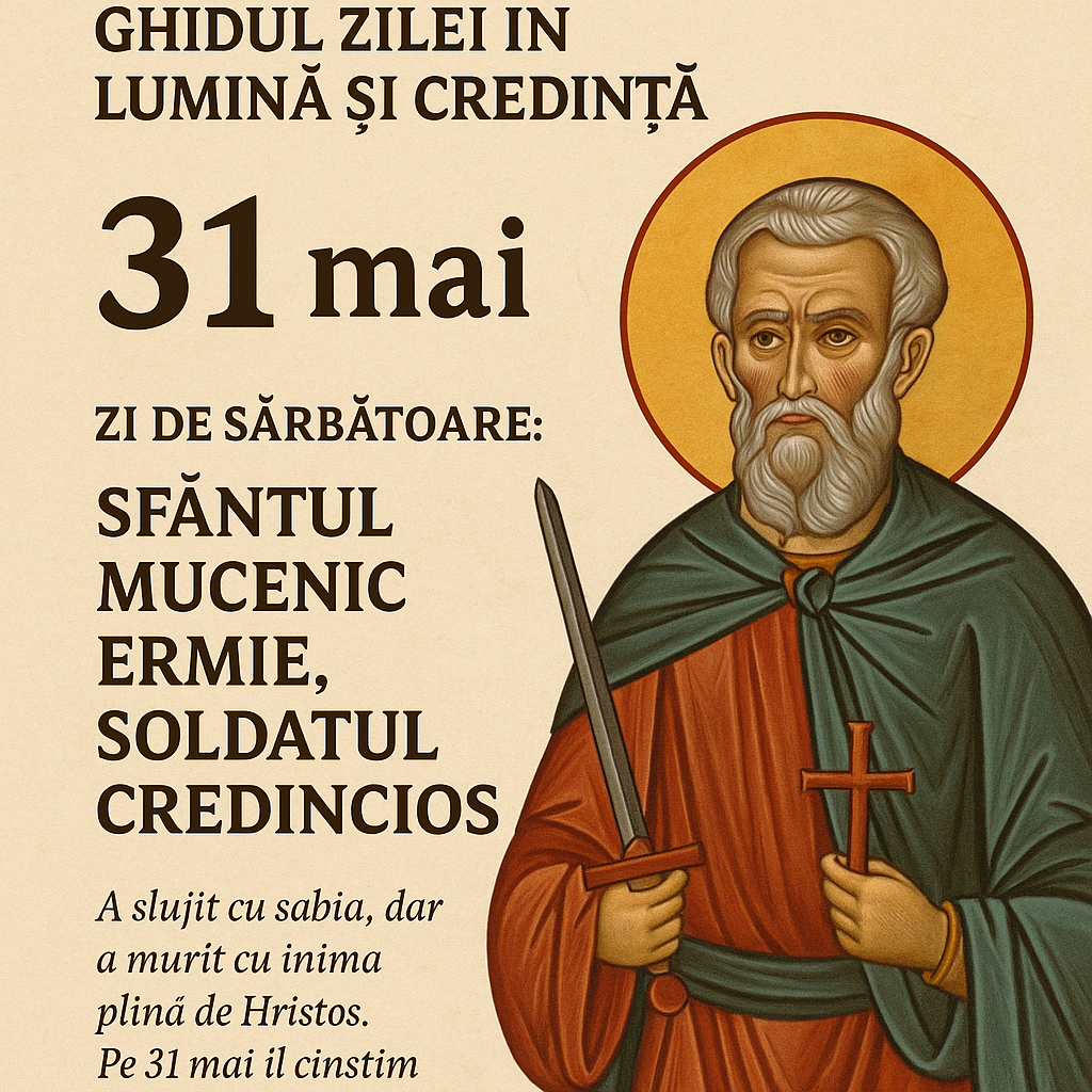 În fiecare an, pe 31 mai, Biserica Ortodoxă îl pomenește pe Sfântul Mucenic Ermie, un soldat roman din cetatea Comane, în Capadocia, care a trăit în timpul împăratului Antonin Pius (138–161). Deși bătrân și slăbit de ani, Ermie era plin de vigoare duhovnicească și fidel Domnului, trăind o viață de curăție, disciplină și rugăciune.