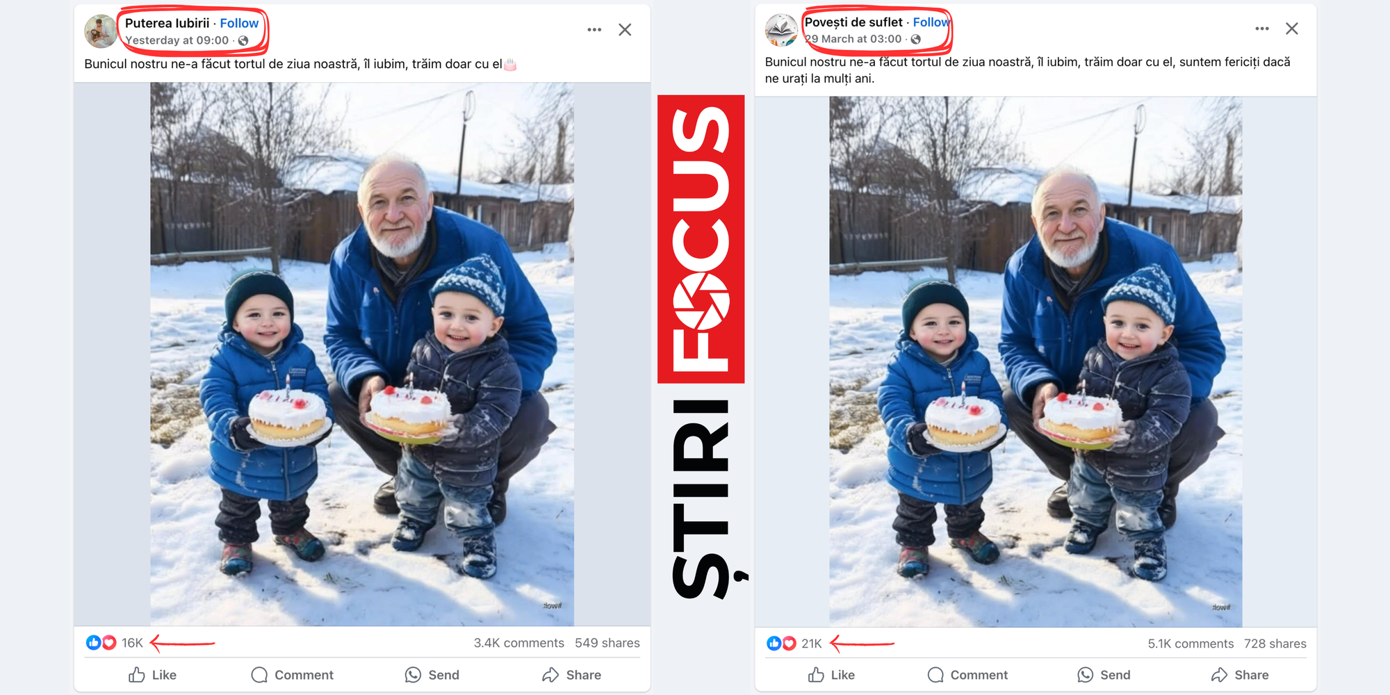 Dar ce se întâmplă dacă aceeași poză și același text apar pe mai multe pagini diferite, la ore diferite, cu mici variațiuni? Ce se întâmplă când acel conținut devine viral și adună zeci de mii de reacții, comentarii și distribuiri? Și mai ales: cine controlează aceste pagini și în ce scop?