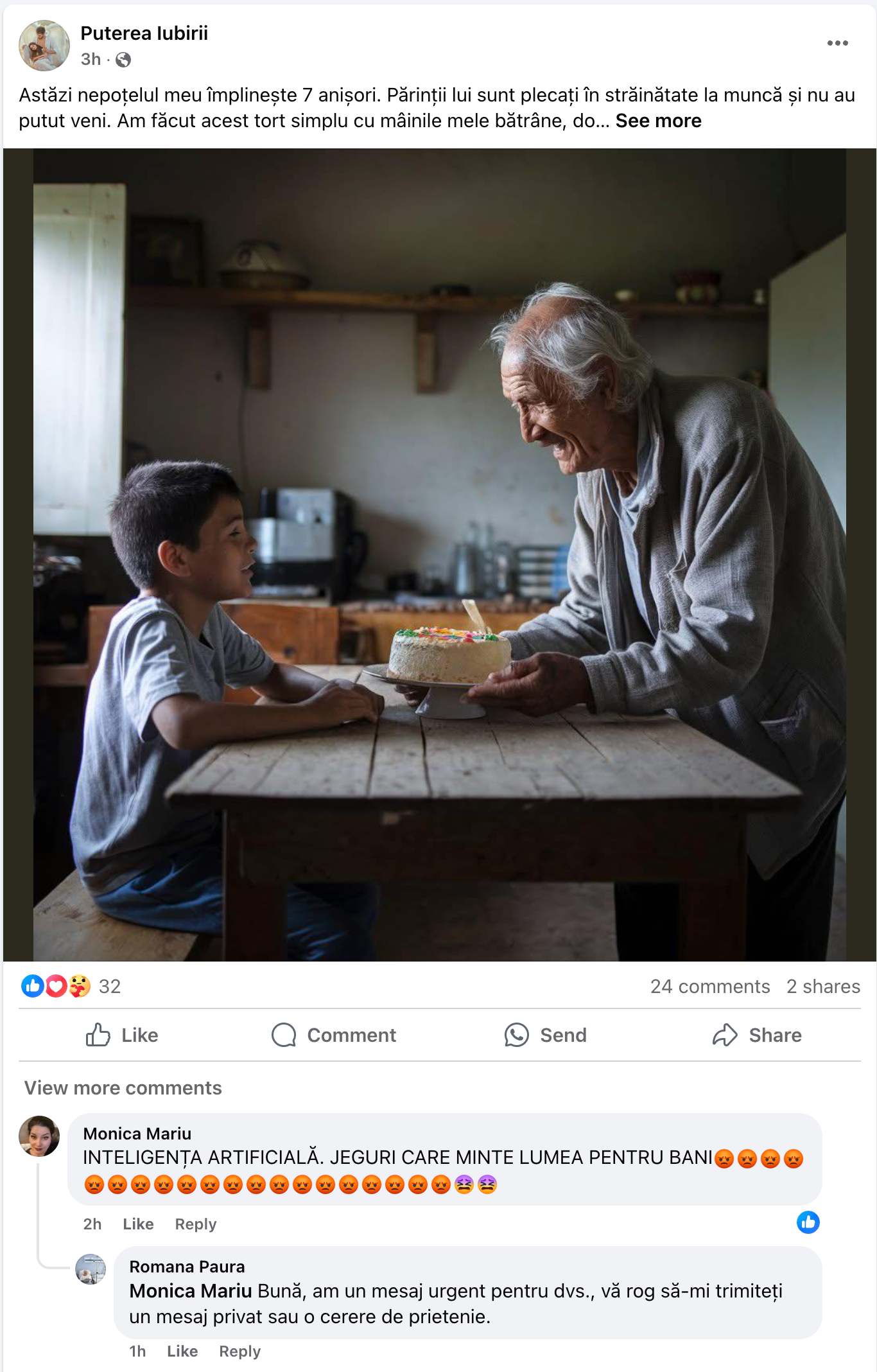 La prima vedere, pare o postare emoționantă: un bunic care a preparat un tort pentru nepoți, un mesaj cald, o imagine dintr-o iarnă de poveste. Genul de conținut care îți face ziua mai frumoasă, îți aduce aminte de familie și te îndeamnă să dai un Like sau un Share din reflex.