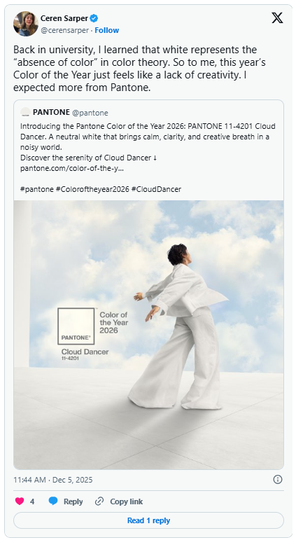 Pantone a desemnat „Cloud Dancer” drept culoarea anului 2026 — un alb imaculat, prezentat ca simbol al seninătății. Dar reacțiile au explodat imediat, criticii acuzând o alegere „surdă la realitate”, cu încărcătură politică nedorită, scrie Euronews.