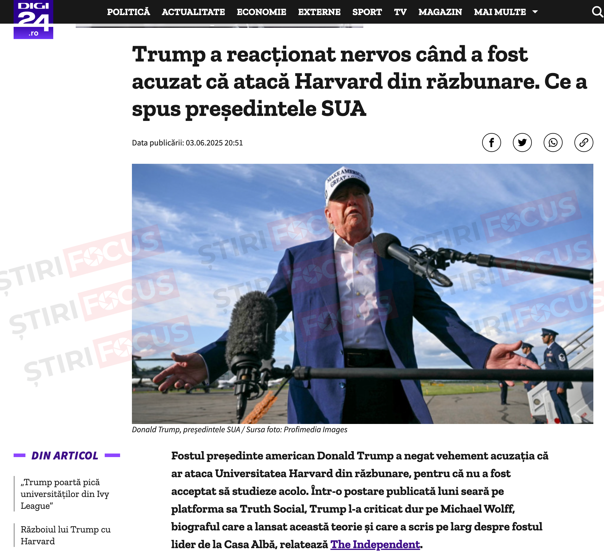 În seara zilei de 3 iunie, Digi24 a publicat un articol despre reacția lui Donald Trump la o teorie apărută în presa americană. Nimic anormal până aici, doar că, în debutul textului, Trump este descris ca fiind „fostul președinte al SUA”.