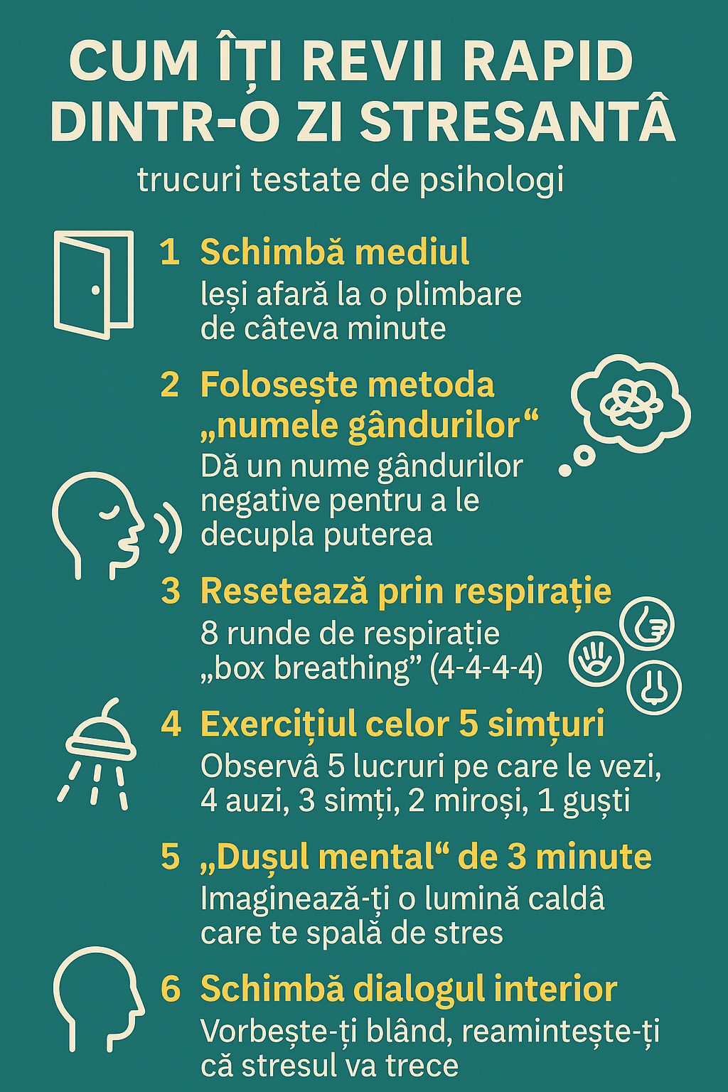 Ai stat la birou sau în trafic toată ziua? Ieși afară. Mergi 5 minute fără telefon, fără scop. Plimbarea scurtă într-un spațiu nou (parc, stradă, balcon) resetează creierul și scade nivelul cortizolului (hormonul stresului).
