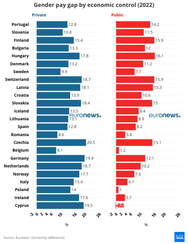 În sectorul public, datorită grilelor salariale reglementate, decalajele sunt mai mici. De exemplu, Cipru este singura țară unde femeile câștigă mai bine decât bărbații în sectorul public (-0,2%).