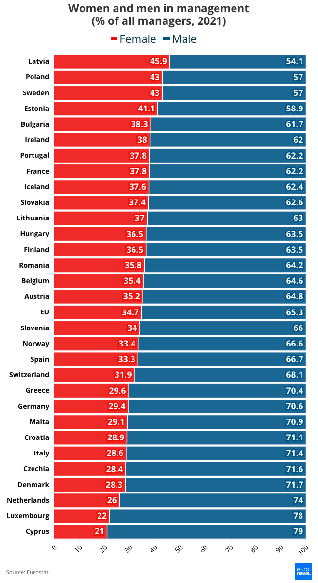 Un factor esențial al decalajului salarial este reprezentarea inegală a femeilor în poziții de conducere. În 2021, doar 35% dintre manageri în UE erau femei, iar salariile pentru femeile manager erau cu 23% mai mici decât cele ale bărbaților.