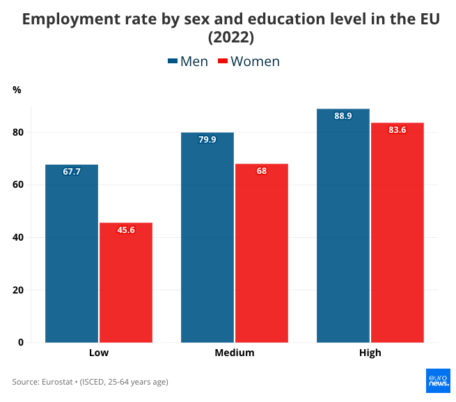 Un paradox interesant este că mai multe femei decât bărbați au studii superioare în UE (37,1% față de 31,4%), dar rata lor de angajare este mai mică.