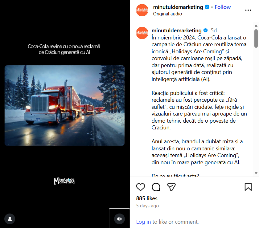 În același timp, un creator olandez a lansat anul acesta o „actriță AI” numită Tilly Norwood, iar Coca-Cola a stârnit critici dure pentru o reclamă compusă integral cu ajutorul AI, descrisă de utilizatori drept „un coșmar vizual”.