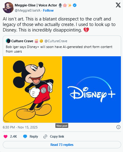 Anunțul CEO-ului Disney, Bob Iger, că Disney+ va permite conținut generat prin inteligență artificială a declanșat reacții puternice online, cu fani și creatori acuzând studioul că subminează artele și pune în pericol joburile din industrie, relatează Euronews.