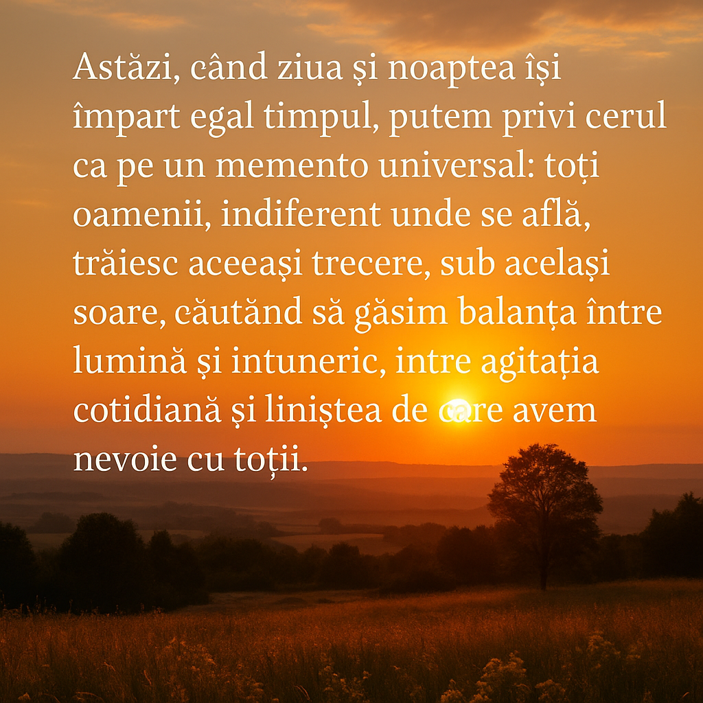 Astăzi, când ziua și noaptea își împart egal timpul, cerul devine un memento universal: toți oamenii, oriunde s-ar afla, trăiesc aceeași trecere sub același soare. Este chemarea de a găsi echilibrul între lumină și întuneric, între agitația cotidiană și liniștea de care avem cu toții nevoie..