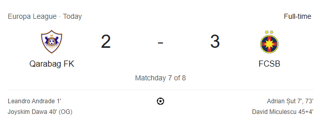 FCSB a obținut o victorie dramatică în etapa a șaptea a Europa League, învingând Qarabag cu scorul de 3-2 pe Stadionul Republican "Tofiq Bahramov" din Baku. Deși au fost conduși de două ori, roș-albaștrii au demonstrat determinare și au revenit spectaculos, asigurându-și trei puncte esențiale în lupta pentru calificare.