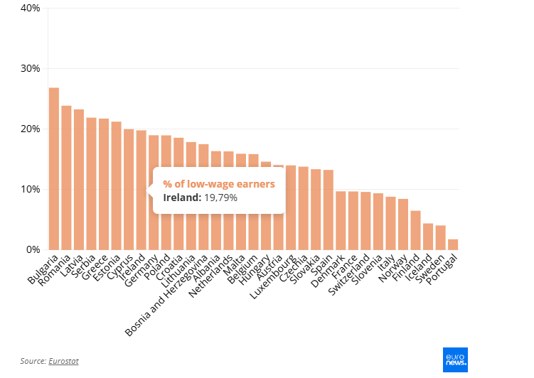 Potrivit unui raport publicat de Euronews pe 18 aprilie 2025, aproape 15% din forța de muncă a Uniunii Europene este formată din angajați cu salarii mici, definiți ca cei care câștigă două treimi sau mai puțin din salariul median al țării lor.
