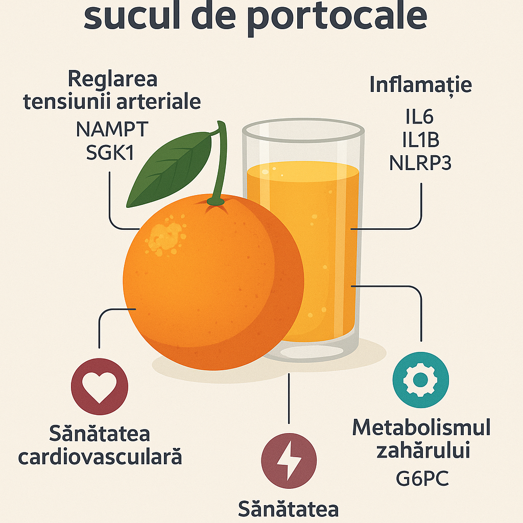 Rezultatele, citate apoi de Euronews Health, conturează o imagine mult mai complexă decât ideea că „sucul de portocale are vitamina C”. Cele mai afectate gene sunt cele asociate cu inflamația cronică de grad scăzut, controlul vasodilatației și metabolismul glucozei — trei domenii esențiale în prevenirea hipertensiunii, diabetului și bolilor cardiometabolice.