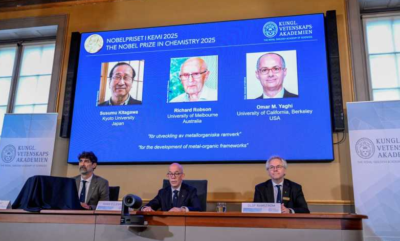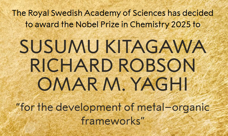 Pe 8 octombrie 2025, Premiul Nobel pentru Chimie a fost acordat cercetătorilor Susumu Kitagawa, Richard Robson și Omar M. Yaghi pentru dezvoltarea materialelor metal-organice (MOF-uri) — structuri capabile să capteze carbonul, să purifice aerul și să extragă apă din aerul deșertic.