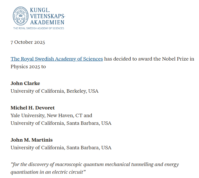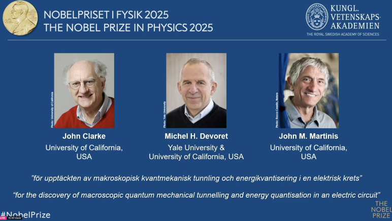 Stockholm, 7 octombrie 2025. — Academia Regală Suedeză de Științe a anunțat laureații Premiului Nobel pentru Fizică: John Clarke, Michel H. Devoret și John M. Martinis, distinși „pentru descoperirea tunelării cuantice macroscopice și cuantificării energiei într-un circuit electric”.