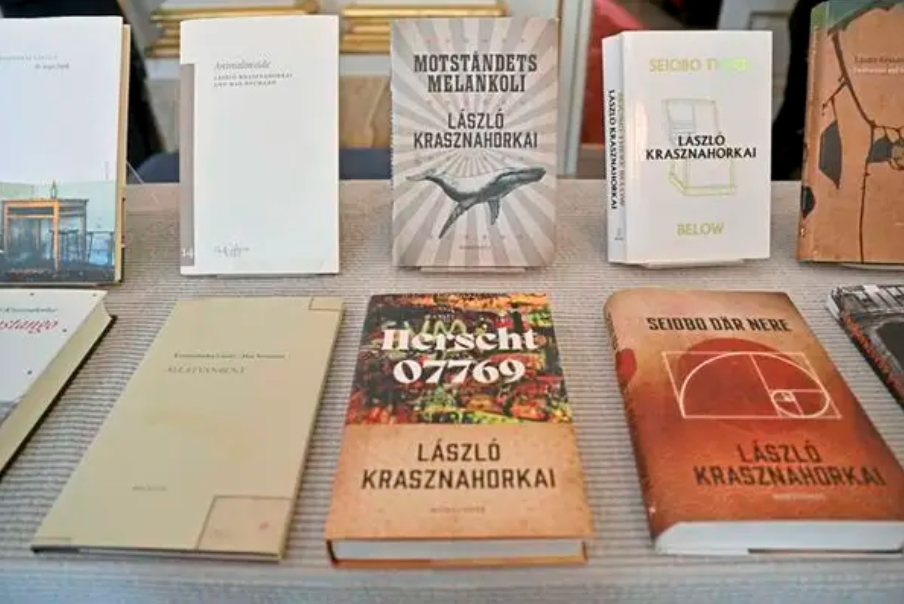 La Academia Suedeză, sala principală a fost transformată într-o expoziție dedicată universului lui Krasznahorkai: pe mese de sticlă, volumele Sátántangó, Melancolia rezistenței, War & War și Seiobo járt odalent au fost expuse sub lumini discrete, ca într-un templu al reflecției.