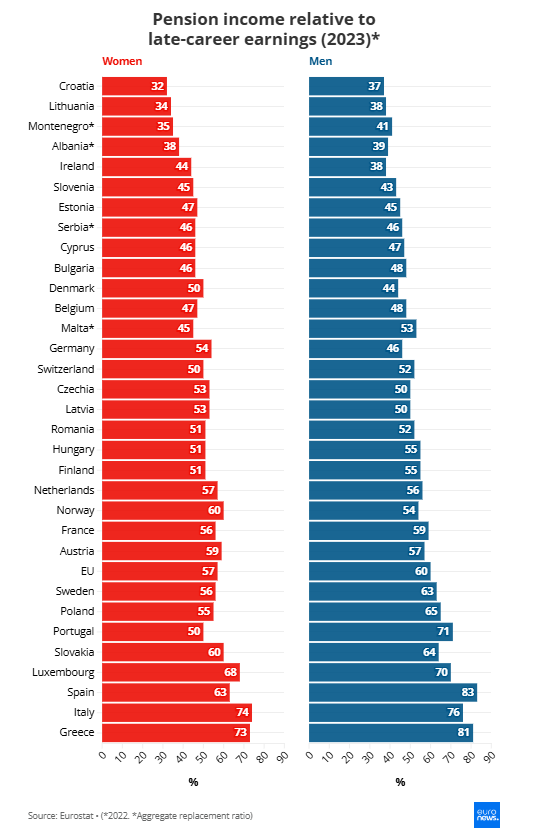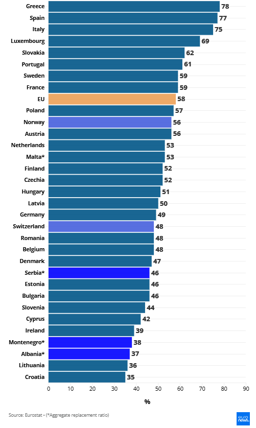 Conform datelor Eurostat, în 2023, rata de înlocuire a pensiilor în UE a variat de la 35% în Croația la 78% în Grecia. Spania (77%) și Italia (75%) au urmat Grecia în frunte, în timp ce Portugalia a depășit și media UE cu un raport de 61%. La polul opus, Lituania (36%) și Irlanda (39%) au urmat Croația, alcătuind cele trei țări cu rate sub 40% în UE.