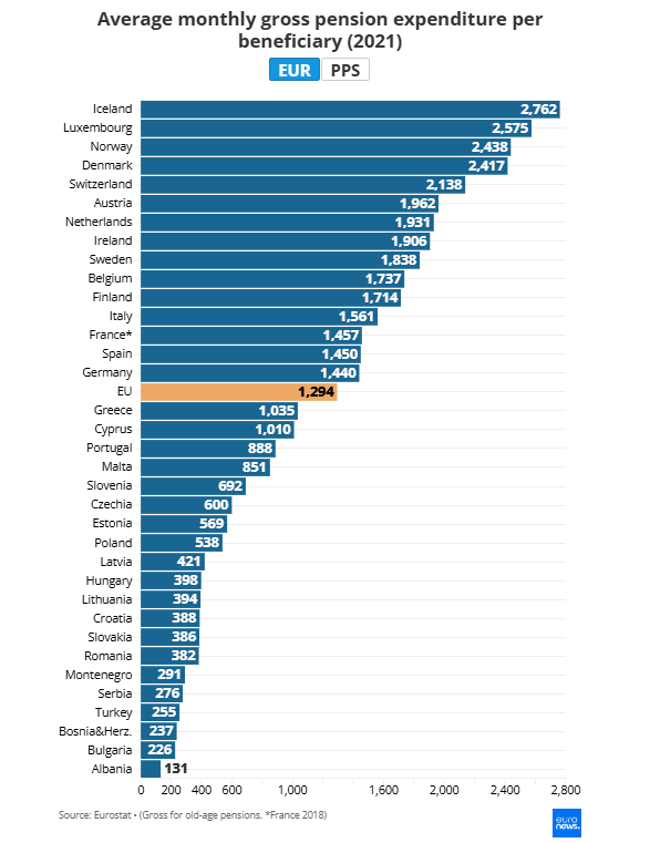 Conform datelor din 2021, Luxemburg se află în fruntea clasamentului, cu o pensie medie de 2.575 EUR pe beneficiar, urmată de Italia cu 1.561 EUR. Franța, Spania și Germania au raportat pensii medii similare, în jur de 1.450 EUR. Media la nivelul Uniunii Europene (UE) a fost de 1.224 EUR.
