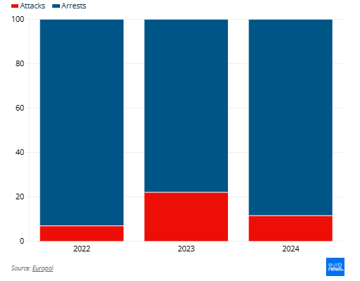Raportul atrage atenția și asupra arestărilor: 449 de persoane au fost reținute în 2024 pentru infracțiuni legate de terorism, în creștere față de 426 în 2023. Cei mai mulți suspecți au fost reținuți în Spania, Franța, Italia și Germania. Din total, 405 erau bărbați și 43 femei.