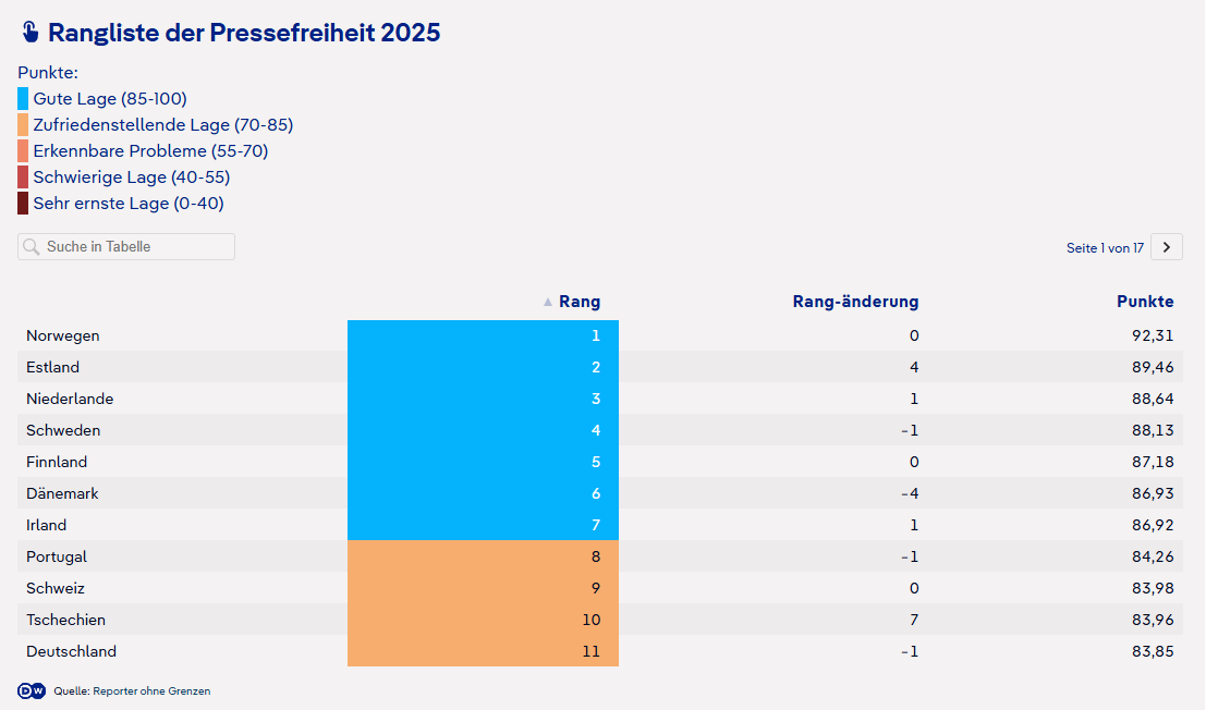 În fruntea clasamentului rămân țările scandinave, recunoscute pentru stabilitatea democratică și legislația avansată în domeniul libertății presei: Norvegia, Estonia, Olanda și Suedia. Ele sunt urmate de câteva democrații consolidate din afara Europei, precum Noua Zeelandă (locul 16) și Trinidad și Tobago (locul 19), care oferă un cadru legal robust, siguranță pentru jurnaliști și diversitate editorială.