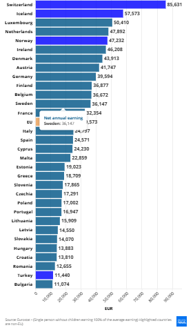 Privind dincolo de granițele Uniunii Europene, Elveția se situează pe prima poziție în ceea ce privește câștigurile medii nete ajustate la PPS, cu 48.331 EUR, urmată de Norvegia (38.712 EUR). Acestea devansează inclusiv Olanda, liderul UE în acest clasament, cu 40.948 EUR. Luxemburg (37.630 EUR) și Austria (37.359 EUR) completează primele cinci poziții.