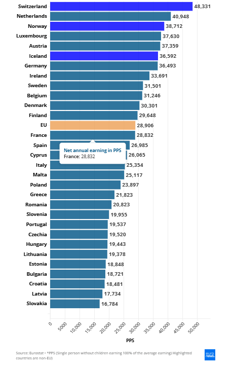 Când câștigurile sunt ajustate la standardele puterii de cumpărare (PPS), decalajele dintre țările membre se mai estompează, dar nu dispar. În 2024, veniturile nete anuale ajustate la PPS au variat de la 16.784 EUR în Slovacia la 40.948 EUR în Țările de Jos. Media Uniunii Europene a fost de 28.906 EUR.
