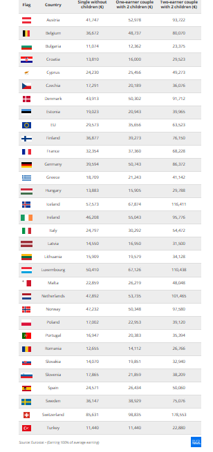 Exemplu concret: în Slovacia, o persoană singură fără copii are un venit net anual de 14.070 EUR, în timp ce un cuplu cu un singur venit și doi copii atinge 19.851 EUR – o diferență de peste 5.700 EUR.