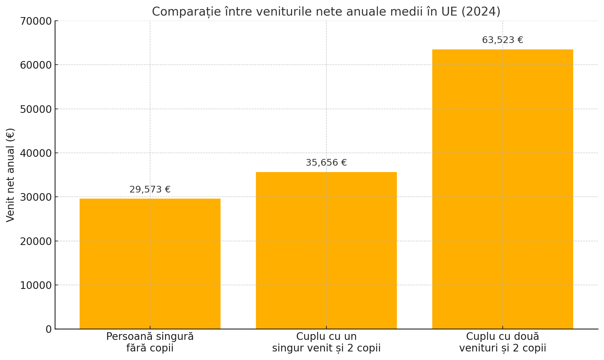Per ansamblu, cifrele arată clar: în Uniunea Europeană, o persoană singură fără copii are un venit net mediu de 29.573 EUR, în timp ce un cuplu cu un singur venit și doi copii câștigă în medie 35.656 EUR – o diferență de peste 6.000 EUR pe an. Această creștere reflectă sprijinul acordat de statele europene familiilor cu copii, prin sisteme fiscale progresive și beneficii sociale specifice.