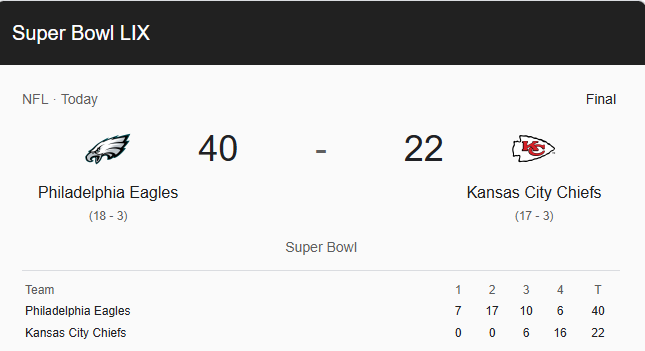 Philadelphia Eagles au învins pe Kansas City Chiefs cu 40-22 în Super Bowl LIX, disputat pe Caesars Superdome. Jalen Hurts a fost desemnat MVP, iar spectacolul a fost completat de prezența vedetelor, inclusiv Taylor Swift și Bradley Cooper, și un show incendiar susținut de Kendrick Lamar și SZA.
