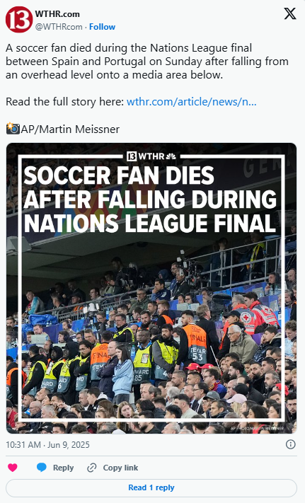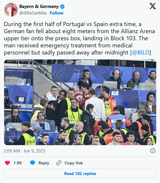 Un spectator german a murit după ce a căzut de la etajul superior al stadionului Allianz Arena, în timpul prelungirilor finalei Ligii Națiunilor dintre Portugalia și Spania. Poliția tratează cazul ca un accident tragic.