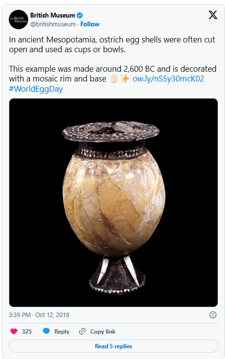 În Mesopotamia antică, oul era un simbol solar, asociat cu regenerarea naturii și ciclul vieții. În Egiptul faraonic, ouăle de struț pictate erau folosite în ritualuri funerare și erau îngropate alături de cei morți, ca semn al unei vieți noi, dincolo de mormânt. În cultura persană, oul decora masa festivă de Nowruz – Anul Nou iranian – fiind un simbol al echilibrului cosmic și al începutului primăverii.